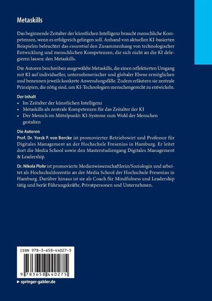 Das beginnende Zeitalter der künstlichen Intelligenz braucht menschliche Kompetenzen, wenn es erfolgreich gelingen soll. Anhand von aktuellen KI-basierten Beispielen beleuchtet das esssential den Zusammenhang von technologischer Entwicklung und menschlichen Kompetenzen, die sich nicht an die KI delegieren lassen: den Metaskills.