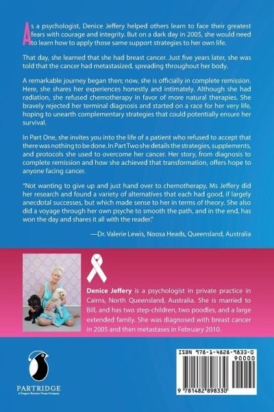 As a psychologist, Denice Jeffery helped others learn to face their greatest fears with courage and integrity. But on a dark day in 2005, she would need to learn how to apply those same support strategies to her own life. That day, she learned that she had breast cancer. Just five years later, she was told that the cancer had metastasized, spreading throughout her body. A remarkable journey began then; now, she is officially in complete remission. Here, she shares her experiences honestly and intimately. Although she had radiation, she refused chemotherapy in favor of more natural therapies. She bravely rejected her terminal diagnosis and started on a race for her very life, hoping to unearth complementary strategies that could potentially ensure her survival. In Part One, she invites you into the life of a patient who refused to accept that there was nothing to be done. In Part Two she details the strategies, supplements, and protocols she used to overcome her cancer. Her story, from diagnosis to complete remission and how she achieved that transformation, offers hope to anyone facing cancer. "Not wanting to give up and just hand over to chemotherapy, Ms Jeffery did her research and found a variety of alternatives that each had good, if largely anecdotal successes, but which made sense to her in terms of theory. She also did a voyage through her own psyche to smooth the path, and in the end, has won the day and shares it all with the reader." -Dr. Val Lewis, Noosa Heads, Queensland, Australia