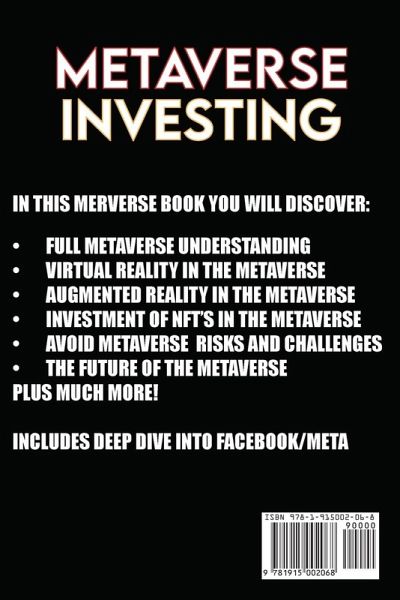 What exactly is the Metaverse?And how can we make money with it? If you want to know more then keep reading... If you've not heard Metaverse is the future! It's planned to be the next big thing in Crypto, in fact many leaders claim its going to be the next stage of the Internet. Facebook (one of the biggest companies in the world) have so much trust in it they've changed their business name to "Meta"! to reflect the investment being made in the Metaverse."Facebook is spending Billions of dollars a year already on the metaverse" (The Guardian 28 Oct 2021). WOW! That's conviction! Bloomberg recently projected the market size of the metaverse to reach $800 billion in 2024! In this Merverse book you will discover:A Full understanding of the Metaverse Virtual Reality in the Metaverse How Augmented Reality works in the Metaverse The investment of NFT's in the Metaverse Avoid Risks and Challenges in the Metaverse The Future of the Metaserve TOP METAVERSE INVESTMENTS TO SKYROCKET! Plus much more we can't list here! THIS IS THE MOST COMPREHENSIVE AND UP TO DATE BOOK ON THE METAVERSE Find out which companies will provide a money-printing bonanza! GET AHEAD OF THE COMPETITION GET THIS METAVERSE BOOK NOW!