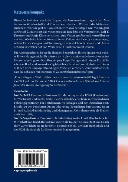 Dieses Buch ist ein erster Aufschlag, um die Auseinandersetzung mit dem Metaverse in Wissenschaft und Praxis voranzutreiben. Wie wird das Metaverse aussehen? Worum geht es? Wo stehen wir? Was benötigen wir? Wohin geht die Reise? Zunächst ist das Metaverse eine Idee bzw. ein Versprechen. Ralf T. Kreutzer und Sonja Klose versuchen, eine Vision greifbar und vorstellbar zu machen. Wie beim Internet ist es zu diesem Zeitpunkt schwierig vorherzusagen, welche Entwicklungen und Technologien von welchen Personen und Unternehmen in welcher Art und Weise erstellt und kombiniert werden.