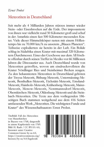 Seit mehr als 4 Milliarden Jahren stürzen immer wieder Stein- oder Eisenbrocken auf die Erde. Der imposanteste von ihnen war vielleicht rund 50 Kilometer groß und schuf in der Antarktis einen fast 500 Kilometer messenden Krater. Viele dieser Himmelskörper rasten mit einem Höllentempo bis zu 70.000 km/h zu unserem "Blauen Planeten". Teilweise explodierten sie bereits in der Luft. Ein Bolide schlug in Südafrika einen Krater mit maximal 320 Kilometern Durchmesser. Eines der Geschosse aus dem All löschte offenbar durch seinen Treffer in Mexiko vor 66 Millionen Jahren die Dinosaurier aus. Auch Deutschland wurde von Meteoriten getroffen, wovon am eindrucksvollsten die Krater Nördlinger Ries und Steinheimer Becken zeugen. Zu den bekanntesten Meteoriten in Deutschland gehören der Treysa-Meteorit, Bitburg-Meteorit, Untermässing-Meteorit, Benthullen-Meteorit, Eichstätt-Meteorit, Emsland-Meteorit, Hainholz-Meteorit, Krähenberg-Meteorit, Mainz-Meteorit, Menow-Meteorit, Nentmannsdorf-Meteorit, Obernkirchen-Meteorit, Oldenburg-Meteorit und die Steinbach-Meteoriten. Die Texte aus dem vorliegenden 186-seitigen Buch stammen weitgehend aus dem 416 Seiten umfassenden Werk "Meteoriten. Die wichtigsten Funde und Krater" des Wissenschaftsautors Ernst Probst.