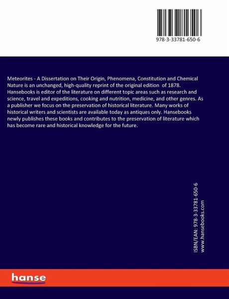 Meteorites - A Dissertation on Their Origin, Phenomena, Constitution and Chemical Nature is an unchanged, high-quality reprint of the original edition of 1878.