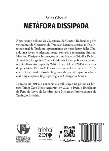 Neste sétimo volume da Colectânea de Contos Traduzidos pelos vencedores do Concurso de Tradução Literária alusivo ao Dia Internacional da Tradução, apresentamos ao nosso leitor Salha Obe-aid, uma jovem e talentosa poeta, contista e romancista Emirati. Metáfora Dissipada, Insinuações de uma Madeixa Grisalha, Reflexo Armadilha, Afogada e Condição Mulher foram publicados no seu terceiro livro, An Implicitly White Lock of Hair (2015), vencedor do prestigioso Prémio Al Owais para Escrita Criativa em 2016. Os contos foram traduzidos das línguas árabe, alemã, espanhola, francesa e inglesa para a língua portuguesa, Changana e Shona. Lançado em 2015, o concurso e a publicação na génese da Editora Trinta Zero Nove venceram em 2021 o Prémio Excelência da Feira do Livro de Londres para Iniciativas Internacionais de Tradução Literária.