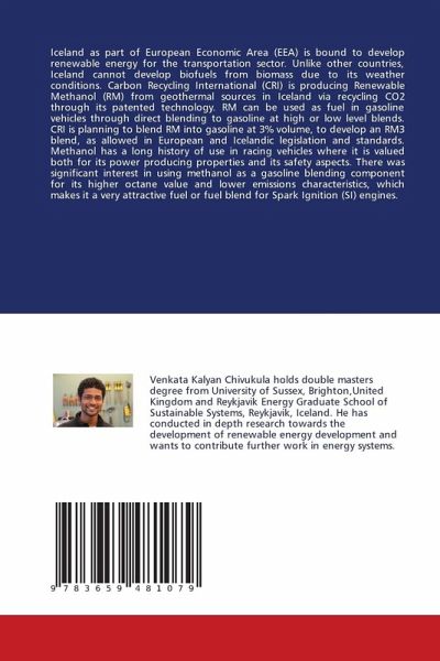 Iceland as part of European Economic Area (EEA) is bound to develop renewable energy for the transportation sector. Unlike other countries, Iceland cannot develop biofuels from biomass due to its weather conditions. Carbon Recycling International (CRI) is producing Renewable Methanol (RM) from geothermal sources in Iceland via recycling CO2 through its patented technology. RM can be used as fuel in gasoline vehicles through direct blending to gasoline at high or low level blends. CRI is planning to blend RM into gasoline at 3% volume, to develop an RM3 blend, as allowed in European and Icelandic legislation and standards. Methanol has a long history of use in racing vehicles where it is valued both for its power producing properties and its safety aspects. There was significant interest in using methanol as a gasoline blending component for its higher octane value and lower emissions characteristics, which makes it a very attractive fuel or fuel blend for Spark Ignition (SI) engines.