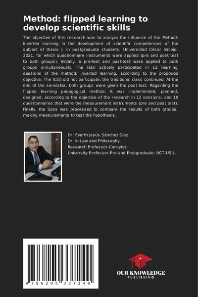 The objective of this research was to analyze the influence of the Method: inverted learning in the development of scientific competencies of the subject of thesis I, in postgraduate students, Universidad César Vallejo, 2021, for which questionnaire instruments were applied (pre and post test to both groups), Initially, a pre-test and post-test were applied to both groups simultaneously. The (EG) actively participated in 12 learning sessions of the method: inverted learning, according to the proposed objective. The (CG) did not participate, the traditional class continued. At the end of the semester, both groups were given the post test. Regarding the flipped learning pedagogical method, it was implemented, planned, designed, according to the objective of the research in 12 sessions; and 10 questionnaires that were the measurement instruments (pre and post test). Finally, the Spss was processed to compare the results of both groups, making measurements to test the hypothesis.
