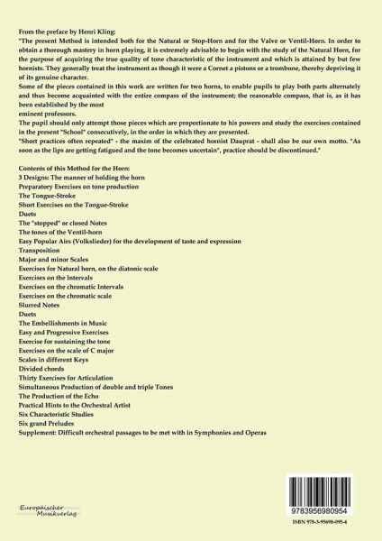From the preface by Henri Kling: \"The present Method is intended both for the Natural or Stop-Horn and for the Valve or Ventil-Horn. In order to obtain a thorough mastery in horn playing, it is extremely advisable to begin with the study of the Natural Horn, for the purpose of acquiring the true quality of tone characteristic of the instrument and which is attained by but few hornists. They generally treat the instrument as though it were a Cornet a pistons or a trombone, thereby depriving it of its genuine character. Some of the pieces contained in this work are written for two horns, to enable pupils to play both parts alternately and thus become acquainted with the entire compass of the instrument; the reasonable compass, that is, as it has been established by the most eminent professors. The pupil should only attempt those pieces which are proportionate to his powers and study the exercises contained in the present \"School\" consecutively, in the order in which they are presented. \"Short practices often repeated\" - the maxim of the celebrated hornist Dauprat - shall also be our own motto. \"As soon as the lips are getting fatigued and the tone becomes uncertain\", practice should be discontinued.\" Contents of this Method for the Horn: 3 Designs: The manner of holding the horn Preparatory Exercises on tone production The Tongue-Stroke Short Exercises on the Tongue-Stroke Duets The \"stopped\" or closed Notes The tones of the Ventil-horn Easy Popular Airs (Volkslieder) for the development of taste and expression Transposition Major and minor Scales Exercises for Natural horn, on the diatonic scale Exercises on the lntervals Exercises on the chromatic Intervals Exercises on the chromatic scale Slurred Notes Duets The Embellishments in Music Easy and Progressive Exercises Exercise for sustaining the tone Exercises on the scale of C major Scales in different Keys Divided chords Thirty Exercises for Articulation Simultaneous Production of double and triple Tones The Production of the Echo Practical Hints to the Orchestral Artist Six Characteristic Studies Six grand Preludes Supplement: Difficult orchestral passages to be met with in Symphonies and Operas