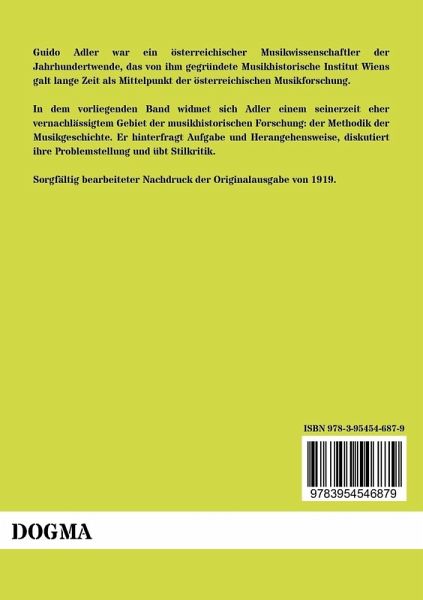 In dem vorliegenden Band widmet sich Adler einem seinerzeit eher vernachlässigtem Gebiet der musikhistorischen Forschung: der Methodik der Musikgeschichte. Er hinterfragt Aufgabe und Herangehensweise, diskutiert ihre Problemstellung und übt Stilkritik.