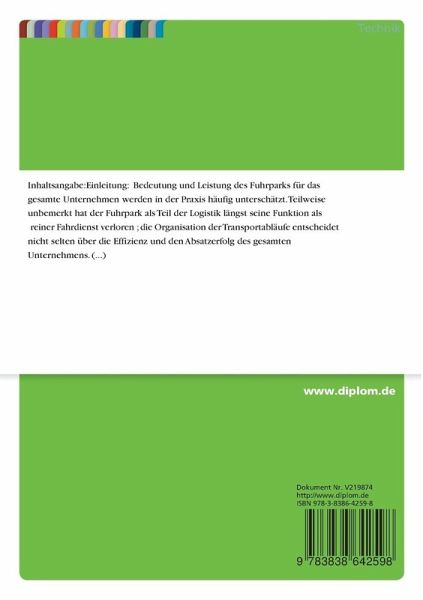 Diplomarbeit aus dem Jahr 1989 im Fachbereich Verkehrswissenschaft, Note: 1,0, Technische Universität Dortmund (Wirtschafts- und Sozialwissenschaften), Sprache: Deutsch, Abstract: Inhaltsangabe:Einleitung: Bedeutung und Leistung des Fuhrparks für das gesamte Unternehmen werden in der Praxis häufig unterschätzt. Teilweise unbemerkt hat der Fuhrpark als Teil der Logistik längst seine Funktion als reiner Fahrdienst verloren ; die Organisation der Transportabläufe entscheidet nicht selten über die Effizienz und den Absatzerfolg des gesamten Unternehmens. Die arbeitsteilige Wirtschaft sowie das Fortschreiten der Produktionstechnologie stellen ständig wachsende Anforderungen an die Logistik und den Warenfluß.