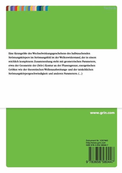 Wissenschaftlicher Aufsatz aus dem Jahr 2014 im Fachbereich Technik, Beuth Hochschule für Technik Berlin (Bionic Research Unit Berlin), Veranstaltung: Bionik, Sprache: Deutsch, Abstract: Eine Kenngröße des Wechselwirkungsgeschehens des halbtauchenden Strömungskörpers im Strömungsfeld ist der Wellenwiderstand, der in einem reichlich komplexem Zusammenhang steht mit geometrischen Parametern, etwa der Geometrie der (Stör-) Kontur an der Phasengrenze, energetischen Größen wie der theoretischen Wellenausbreitungs- und der tatsächlichen Strömungskörpergeschwindigkeit und anderen Parametern. Der nachstehende Aufsatz führt auf eine Darstellung des Wellenwiderstandskoeffizienten als Funktion der Froudezahl in einer Ersatzfunktion (Polynom 3ten Grades) die bestimmte Gütekriterien erfüllt und auch für numerische Implementationen geeignet ist.