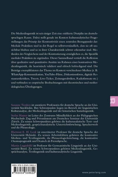Die Medienlinguistik ist seit einiger Zeit eine etablierte Disziplin im deutschsprachigen Raum. Dabei stellt gerade im Kontext kulturanalytischer Fragestellungen das Prinzip der Kontrastivität einen zentralen Bezugspunkt dar: Mediale Praktiken sind in der Regel so selbstverständlich, dass sie oft unsichtbar bleiben und so in ihrer Charakteristik schwer erkennbar sind. Methoden des Vergleichens und der Kontrastierung ermöglichen es, die Spezifik medialer Praktiken zu ergründen. Dieser Sammelband vertieft die Reflexion über qualitative und quantitative Ansätze im Rahmen einer kontrastiven Medienlinguistik, die heuristisch validiert und ethisch befriedigend sind. Die Beiträge exemplifizieren das Thema im Kontext verschiedener Medien (z. B. WhatsApp-Kommunikation, YouTube-Filme, Diskussionsforen, digitale Restaurantkritiken, Tweets, Live-Ticker, Zeitungsrubriken, Radioformate etc.) und verbinden so empirische Beobachtungen mit theoretischen und methodologischen Überlegungen.