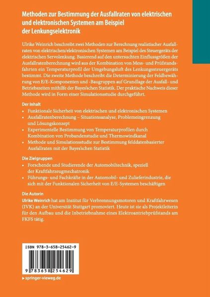 Ulrike Weinrich beschreibt zwei Methoden zur Berechnung realistischer Ausfallraten von elektrischen/elektronischen Systemen am Beispiel des Steuergeräts der elektrischen Servolenkung. Basierend auf den untersuchten Einflussgrößen der Ausfallratenberechnung wird aus der Kombination von Mess- und Prüfstandsfahrten ein Temperaturprofil der Umgebungsluft des Lenkungssteuergeräts bestimmt. Die zweite Methode beschreibt die Determinierung der Feldbewährung von E/E-Komponenten und -Baugruppen auf Grundlage der Ausfall- und Betriebszeiten mithilfe der Bayes'schen Statistik. Der praktische Nachweis dieser Methode wird in Form einer Simulationsstudie durchgeführt.