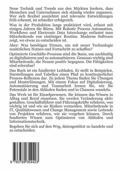 Neue Technik und Trends aus den Märkten fordern, dass Menschen und Unternehmen sich ständig wieder anpassen. Wer sich flexibel ausrichtet und relevante Entwicklungen früh erkennt, ist schneller erfolgreich. Was in der Produktion lange praktiziert wird, erfasst seit einigen Jahren die Büros. Mit Robotic Process Automation, Workflows und Electronic Data Interchange entlastet man Mitarbeitende von eintöniger Routine. Moderne Software zeigt, wo etwas zu entscheiden ist. Aber: Was benötigen Firmen, um mit neuer Technologie zusätzlichen Nutzen und Fortschritt zu schaffen? Optimierte Geschäfts-Prozesse sind die Basis, um nachhaltig zu digitalisieren und zu automatisieren. Genauso wichtig sind Mitarbeitende, die Neuem positiv begegnen. Die Fähigkeiten sind erlernbar! Das Buch ist ein fundierter Leitfaden. Er stellt in Beispielen, Darstellungen und Tabellen einen Pfad zu kontinuierlicher Prozess-Reflexion dar. Zu jedem Thema finden Sie Übungen und Musterlösungen. Mit einem Fokus auf Digitalisierung, Automatisierung und Teamarbeit lernen Sie, wie Sie Potenziale in den Abläufen finden und in Chancen wandeln. Das Werk ist für Einzelpersonen. Sie können das Wissen in Alltag und Beruf einsetzen. Sie werden Veränderung aktiv gestalten. Geschäftsführer und Führungskräfte erfahren, was wichtig ist und wie sie Risiken vermeiden. Mitarbeitende in IT, Qualitätswesen und Change Management sowie Leitende von Projekten erfahren, wie sie vorgehen können. Durch fundiertes Wissen zum Optimieren von Abläufen und Informationstechnik. Begeben Sie sich auf den Weg, datengestützt zu handeln und zu entscheiden.