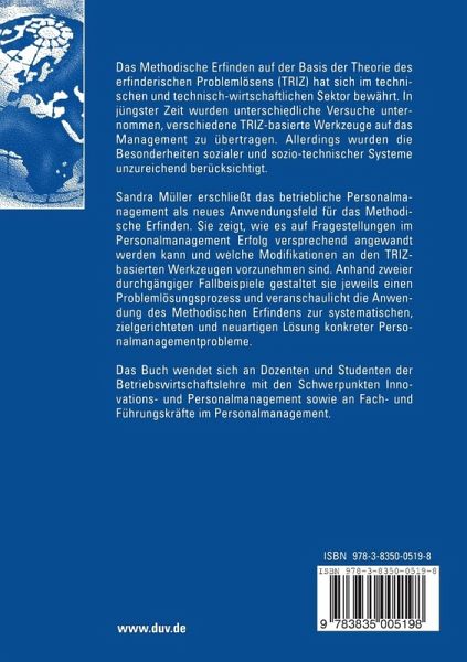 Sandra Müller erschließt das betriebliche Personalmanagement als neues Anwendungsfeld für das Methodische Erfinden. Sie zeigt, wie es auf Fragestellungen im Personalmanagement Erfolg versprechend angewandt werden kann und welche Modifikationen an den TRIZ-basierten Werkzeugen vorzunehmen sind. Anhand zweier durchgängiger Fallbeispiele gestaltet sie jeweils einen Problemlösungsprozess und veranschaulicht die Anwendung des Methodischen Erfindens zur systematischen, zielgerichteten und neuartigen Lösung konkreter Personalmanagementprobleme.