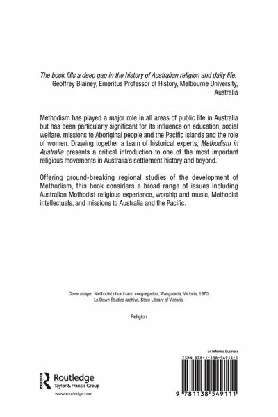 Methodism has played a major role in all areas of public life in Australia but has been particularly significant for its influence on education, social welfare, missions to Aboriginal people and the Pacific Islands and the role of women. Drawing together a team of historical experts, Methodism in Australia presents a critical introduction to one of the most important religious movements in Australia's settlement history and beyond. Offering ground-breaking regional studies of the development of Methodism, this book considers a broad range of issues including Australian Methodist religious experience, worship and music, Methodist intellectuals, and missions to Australia and the Pacific.