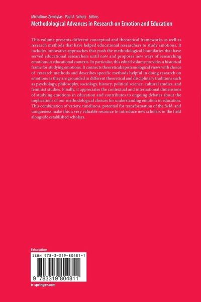 This volume presents different conceptual and theoreticalframeworks as well as research methods that have helped educational researchersto study emotions. It includes innovative approaches that push themethodological boundaries that have served educational researchers until nowand proposes new ways of researching emotions in educational contexts. In particular,this edited volume provides a historical frame for studying emotions. Itconnects theoretical/epistemological views with choice of research methods and describes specificmethods helpful in doing research on emotions as they are grounded in differenttheoretical and disciplinary traditions such as psychology, philosophy,sociology, history, political science, cultural studies, and feminist studies.Finally, it appreciates the contextual and international dimensions of studyingemotions in education and contributes to ongoing debates about the implicationsof our methodological choices for understanding emotion in education. Thiscombination of variety, timeliness, potential for transformation of the field,and uniqueness make this a very valuable resource to introduce new scholars inthe field alongside established scholars.
