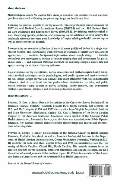 This book is written for professionals who wish to learn about methodological issues associated with health care surveys. It represents a distinct and important contribution to the application of the methodology of sample surveys to the collection of data on the utilization of health care services.