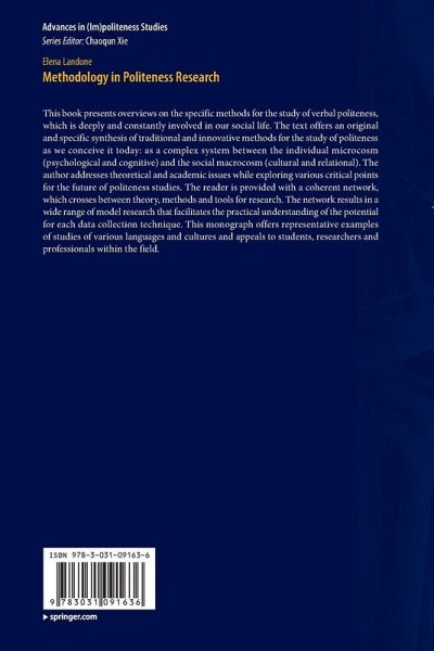 This book presents overviews on the specific methods for the study of verbal politeness, which is deeply and constantly involved in our social life. The text offers an original and specific synthesis of traditional and innovative methods for the study of politeness as we conceive it today: as a complex system between the individual microcosm (psychological and cognitive) and the social macrocosm (cultural and relational). The author addresses theoretical and academic issues while exploring various critical points for the future of politeness studies. The reader is provided with a coherent network, which crosses between theory, methods and tools for research. The network results in a wide range of model research that facilitates the practical understanding of the potential for each data collection technique. This monograph offers representative examples of studies of various languages and cultures and appeals to students, researchers and professionals within the field.