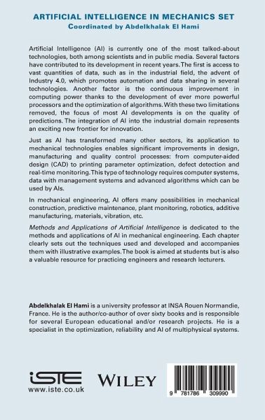 Artificial Intelligence (AI) is currently one of the most talked-about technologies, both among scientists and in public media. Several factors have contributed to its development in recent years. The first is access to vast quantities of data, such as in the industrial field, the advent of Industry 4.0, which promotes automation and data sharing in several technologies. Another factor is the continuous improvement in computing power thanks to the development of ever more powerful processors and the optimization of algorithms. With these two limitations removed, the focus of most AI developments is on the quality of predictions. The integration of AI into the industrial domain represents an exciting new frontier for innovation. Just as AI has transformed many other sectors, its application to mechanical technologies enables significant improvements in design, manufacturing and quality control processes: from computer-aided design (CAD) to printing parameter optimization, defect detection and real-time monitoring. This type of technology requires computer systems, data with management systems and advanced algorithms which can be used by AIs. In mechanical engineering, AI offers many possibilities in mechanical construction, predictive maintenance, plant monitoring, robotics, additive manufacturing, materials, vibration, etc. Methods and Applications of Artificial Intelligence is dedicated to the methods and applications of AI in mechanical engineering. Each chapter clearly sets out the techniques used and developed and accompanies them with illustrative examples. The book is aimed at students but is also a valuable resource for practicing engineers and research lecturers.