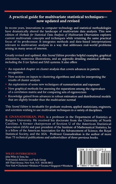 A practical guide for multivariate statistical techniques-- now updated and revised In recent years, innovations in computer technology and statistical methodologies have dramatically altered the landscape of multivariate data analysis. This new edition of Methods for Statistical Data Analysis of Multivariate Observations explores current multivariate concepts and techniques while retaining the same practical focus of its predecessor. It integrates methods and data-based interpretations relevant to multivariate analysis in a way that addresses real-world problems arising in many areas of interest. Greatly revised and updated, this Second Edition provides helpful examples, graphical orientation, numerous illustrations, and an appendix detailing statistical software, including the S (or Splus) and SAS systems. It also offers * An expanded chapter on cluster analysis that covers advances in pattern recognition * New sections on inputs to clustering algorithms and aids for interpreting the results of cluster analysis * An exploration of some new techniques of summarization and exposure * New graphical methods for assessing the separations among the eigenvalues of a correlation matrix and for comparing sets of eigenvectors * Knowledge gained from advances in robust estimation and distributional models that are slightly broader than the multivariate normal This Second Edition is invaluable for graduate students, applied statisticians, engineers, and scientists wishing to use multivariate techniques in a variety of disciplines.