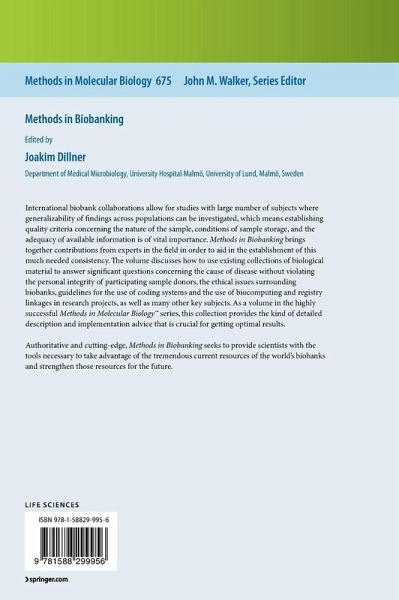 International biobank collaborations allow for studies with large number of subjects where generalizability of findings across populations can be investigated, which means establishing quality criteria concerning the nature of the sample, conditions of sample storage, and the adequacy of available information is of vital importance. Methods in Biobanking brings together contributions from experts in the field in order to aid in the establishment of this much needed consistency. The volume discusses how to use existing collections of biological material to answer significant questions concerning the cause of disease without violating the personal integrity of participating sample donors, the ethical issues surrounding biobanks, guidelines for the use of coding systems and the use of biocomputing and registry linkages in research projects, as well as many other key subjects. As a volume in the highly successful Methods in Molecular Biology(TM) series, this collection provides the kind of detailed description and implementation advice that is crucial for getting optimal results.Authoritative and cutting-edge, Methods in Biobanking seeks to provide scientists with the tools necessary to take advantage of the tremendous current resources of the world's biobanks and strengthen those resources for the future.