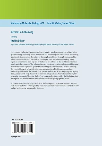 International biobank collaborations allow for studies with large number of subjects where generalizability of findings across populations can be investigated, which means establishing quality criteria concerning the nature of the sample, conditions of sample storage, and the adequacy of available information is of vital importance. Methods in Biobanking brings together contributions from experts in the field in order to aid in the establishment of this much needed consistency. The volume discusses how to use existing collections of biological material to answer significant questions concerning the cause of disease without violating the personal integrity of participating sample donors, the ethical issues surrounding biobanks, guidelines for the use of coding systems and the use of biocomputing and registry linkages in research projects, as well as many other key subjects. As a volume in the highly successful Methods in Molecular Biology(TM) series, this collection provides the kind of detailed description and implementation advice that is crucial for getting optimal results.Authoritative and cutting-edge, Methods in Biobanking seeks to provide scientists with the tools necessary to take advantage of the tremendous current resources of the world's biobanks and strengthen those resources for the future.