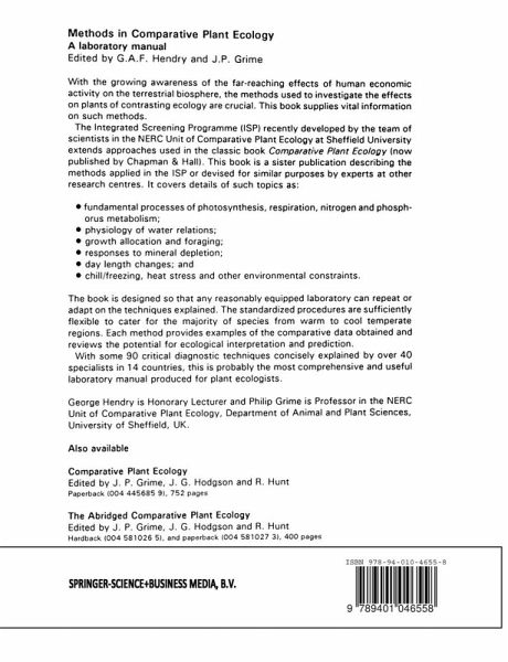 Methods in Comparative Plant Ecology: A laboratory manual is a sister book to the widely acclaimed Comparative Plant Ecology by Grime, Hodgson and Hunt. It contains details on some 90 critical concise diagnostic techniques by over 40 expert contributors. In one volume it provides an authoritative bench-top guide to diagnostic techniques in experimental plant ecology.
