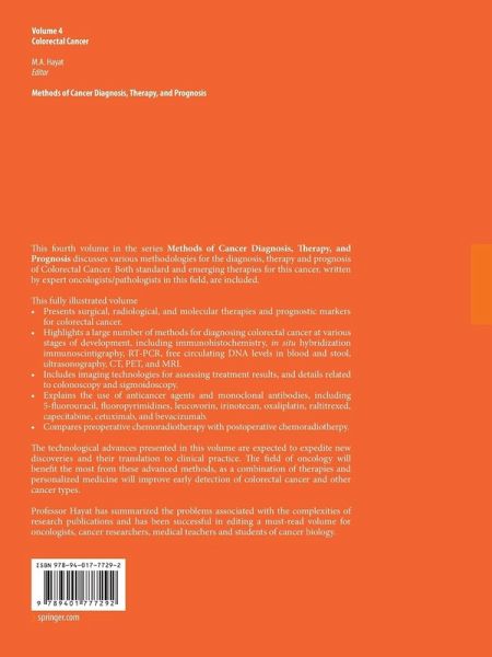 This fourth volume in the series Methods of Cancer Diagnosis, Therapy and Prognosis discusses various methodologies for the diagnosis, therapy and prognosis of Colorectal Cancer. Both standard and emerging therapies for this cancer, written by expert oncologists/pathologists in this field, are included.