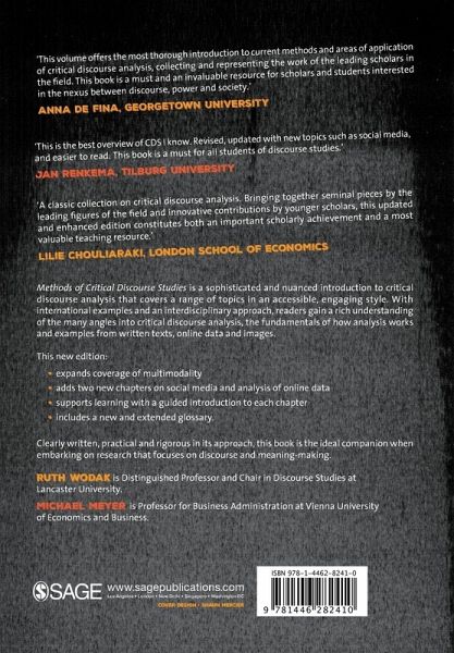 Chapter 1: Critical Discourse Studies: History, Agenda, Theory, and Methodology - Ruth Wodak & Michael Meyer Chapter 2: The Discourse-Historical Approach (DHA) - Martin Reisigl and Ruth Wodak Chapter 3: Critical Discourse Studies: A Sociocognitive Approach - Teun A. van Dijk Chapter 4: A dialectical-relation approach to critical discourse analysis in social research - Norman Fairclough Chapter 5: Analysing discourses and dispositives: a Foucauldian approach to theory and methodology - Siegfried Jäger and Florentine Maier Chapter 6: Discourse as the recontextualization of social practice - a guide - Theo van Leeuwen Chapter 7: Checks and balances: how corpus linguistics can contribute to CDA - Gerlinde Mautner Chapter 8: Critical Analysis of Visual and Multimodal Texts - Dennis Jancsary, Markus A. Höllerer, Renate E. Meyer Chapter 9: Critical discourse studies and social media: power, resistance and critique in changing media ecologies - Majid KhosraviNik and Johann W. Unger