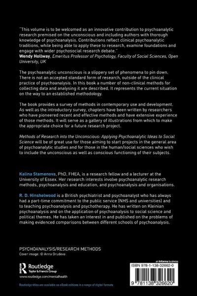 Kalina Stamenova, PhD, FHEA, is a research fellow and a lecturer at the University of Essex. Her research interests involve psychoanalytic research methods, psychoanalysis and education, and psychoanalysis and organisations. R. D. Hinshelwood is a British psychiatrist and psychoanalyst who has always had a part-time commitment to the public service (NHS and universities) and to teaching psychoanalysis and psychotherapy. He has written on Kleinian psychoanalysis and on the application of psychoanalysis to social science and political themes. He has taken an interest in and published on the problems of making evidenced comparisons between different schools of psychoanalysis.