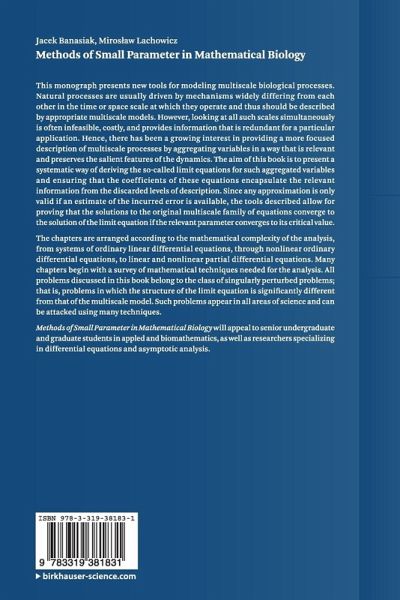 This monograph presents new tools for modeling multiscale biological processes. Natural processes are usually driven by mechanisms widely differing from each other in the time or space scale at which they operate and thus should be described by appropriate multiscale models. However, looking at all such scales simultaneously is often infeasible, costly, and provides information that is redundant for a particular application. Hence, there has been a growing interest in providing a more focused description of multiscale processes by aggregating variables in a way that is relevant to the purpose at hand and preserves the salient features of the dynamics. Many ad hoc methods have been devised, and the aim of this book is to present a systematic way of deriving the so-called limit equations for such aggregated variables and ensuring that the coefficients of these equations encapsulate the relevant information from the discarded levels of description. Since any approximation is only valid if an estimate of the incurred error is available, the tools the authors describe allow for proving that the solutions to the original multiscale family of equations converge to the solution of the limit equation if the relevant parameter converges to its critical value. The chapters are arranged according to the mathematical complexity of the analysis, from systems of ordinary linear differential equations, through nonlinear ordinary differential equations, to linear and nonlinear partial differential equations. Many chapters begin with a survey of mathematical techniques needed for the analysis. All problems discussed in this book belong to the class of singularly perturbed problems; that is, problems in which the structure of the limit equation is significantly different from that of the multiscale model. Such problems appear in all areas of science and can be attacked using many techniques. Methods of Small Parameter in Mathematical Biology will appeal to seniorundergraduate and graduate students in applied and biomathematics, as well as researchers specializing in differential equations and asymptotic analysis.
