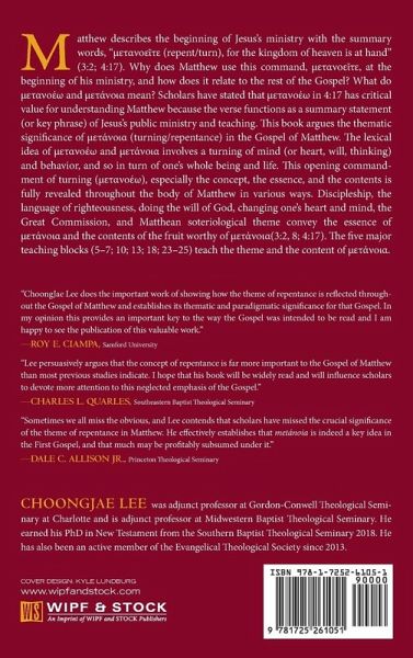 Matthew describes the beginning of Jesus's ministry with the summary words, ""¿¿¿¿¿¿¿¿¿¿ (repent/turn), for the kingdom of heaven is at hand"" (3:2; 4:17). Why does Matthew use this command, ¿¿¿¿¿¿¿¿¿¿, at the beginning of his ministry, and how does it relate to the rest of the Gospel? What do ¿¿¿¿¿¿¿¿ and ¿¿¿¿¿¿¿¿ mean? Scholars have stated that ¿¿¿¿¿¿¿¿ in 4:17 has critical value for understanding Matthew because the verse functions as a summary statement (or key phrase) of Jesus's public ministry and teaching. This book argues the thematic significance of ¿¿¿¿¿¿¿¿ (turning/repentance) in the Gospel of Matthew. The lexical idea of ¿¿¿¿¿¿¿¿ and ¿¿¿¿¿¿¿¿ involves a turning of mind (or heart, will, thinking) and behavior, and so in turn of one's whole being and life. This opening commandment of turning (¿¿¿¿¿¿¿¿), especially the concept, the essence, and the contents is fully revealed throughout the body of Matthew in various ways. Discipleship, the language of righteousness, doing the will of God, changing one's heart and mind, the Great Commission, and Matthean soteriological theme convey the essence of ¿¿¿¿¿¿¿¿ and the contents of the fruit worthy of ¿¿¿¿¿¿¿¿(3:2, 8; 4:17). The five major teaching blocks (5-7; 10; 13; 18; 23-25) teach the theme and the content of ¿¿¿¿¿¿¿¿.