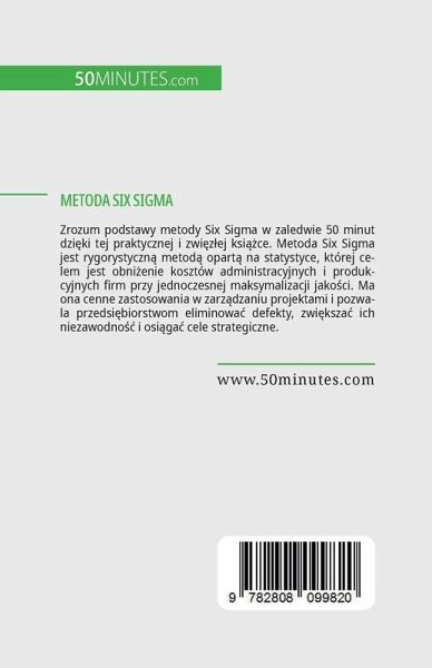 Zrozum podstawy metody Six Sigma w zaledwie 50 minut dzi¿ki tej praktycznej i zwi¿z¿ej ksi¿¿ce. Metoda Six Sigma jest rygorystyczn¿ metod¿ opart¿ na statystyce, której celem jest obni¿enie kosztów administracyjnych i produkcyjnych firm przy jednoczesnej maksymalizacji jaköci. Ma ona cenne zastosowania w zarz¿dzaniu projektami i pozwala przedsi¿biorstwom eliminowä defekty, zwi¿kszä ich niezawodnö¿ i osi¿gä cele strategiczne. Ta ksi¿¿ka zapewni Ci por¿czne wprowadzenie do zastosowä Six Sigma w celu optymalizacji procesów, zwi¿kszenia niezawodnöci i podniesienia wydajnöci. Zawiera równie¿ analiz¿ korzy¿ci, jakie Six Sigma przynios¿a rzeczywistym firmom, w tym Motoroli, General Electric i Bank of America, omówienie wad tego podej¿cia oraz wprowadzenie do modeli pokrewnych, takich jak Lean Six Sigma i Total Quality Managment (TQM). O metodzie Six Sigma : Metoda Six Sigma to ustrukturyzowane jaköciowe i ilöciowe podej¿cie do zarz¿dzania przedsi¿biorstwem, którego celem jest osi¿gni¿cie ponad 99,99% niezawodnöci w kluczowych procesach biznesowych. Po raz pierwszy pojawi¿a si¿ w latach 80-tych i rozpowszechni¿a w nast¿pnej dekadzie, przynosz¿c natychmiastowe i znaczne korzy¿ci wielu firmom. Obecnie wiele düych firm preferuje ten system i jest on nauczany w wiod¿cych szköach biznesu na cäym ¿wiecie. W tej ksi¿¿ce odkryjesz, jak metoda Six Sigma möe pomóc Twojej firmie, zrozumiesz le¿¿c¿ u jej podstaw teori¿ i zwi¿zane z ni¿ metody statystyczne oraz dowiesz si¿, jak skutecznie j¿ wdröy¿. Jasne wyjänienie korzy¿ci i potencjalnych wad metody, omówienie praktycznego studium przypadku oraz wprowadzenie do pokrewnych modeli da Ci narz¿dzia potrzebne do dostosowania podej¿cia do Twojej sytuacji.