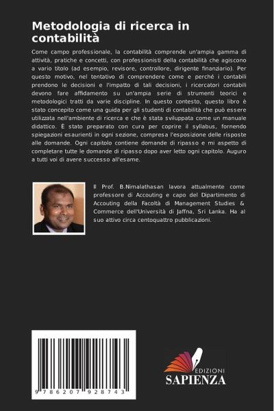 Come campo professionale, la contabilità comprende un'ampia gamma di attività, pratiche e concetti, con professionisti della contabilità che agiscono a vario titolo (ad esempio, revisore, controllore, dirigente finanziario). Per questo motivo, nel tentativo di comprendere come e perché i contabili prendono le decisioni e l'impatto di tali decisioni, i ricercatori contabili devono fare affidamento su un'ampia serie di strumenti teorici e metodologici tratti da varie discipline. In questo contesto, questo libro è stato concepito come una guida per gli studenti di contabilità che può essere utilizzata nell'ambiente di ricerca e che è stata sviluppata come un manuale didattico. È stato preparato con cura per coprire il syllabus, fornendo spiegazioni esaurienti in ogni sezione, compresa l'esposizione delle risposte alle domande. Ogni capitolo contiene domande di ripasso e mi aspetto di completare tutte le domande di ripasso dopo aver letto ogni capitolo. Auguro a tutti voi di avere successo all'esame.
