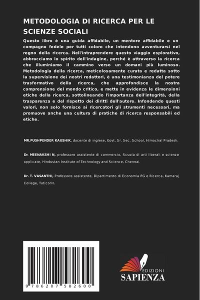 Questo libro è una guida affidabile, un mentore affidabile e un compagno fedele per tutti coloro che intendono avventurarsi nel regno della ricerca. Nell'intraprendere questo viaggio esplorativo, abbracciamo lo spirito dell'indagine, perché è attraverso la ricerca che illuminiamo il cammino verso un domani più luminoso. Metodologia della ricerca, meticolosamente curata e redatta sotto la supervisione dei nostri redattori, è una testimonianza del potere trasformativo della ricerca, che approfondisce la nostra comprensione del mondo critico, e mette in evidenza le dimensioni etiche della ricerca, sottolineando l'importanza dell'integrità, della trasparenza e del rispetto dei diritti dell'autore. Infondendo questi valori, non solo fornisce ai ricercatori gli strumenti necessari, ma promuove anche una cultura di pratiche di ricerca responsabili ed etiche.
