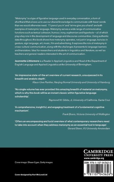'Metonymy' is a type of figurative language used in everyday conversation, a form of shorthand that allows us to use our shared knowledge to communicate with fewer words than we would otherwise need. 'I'll pencil you in' and 'let me give you a hand' are both examples of metonymic language. Metonymy serves a wide range of communicative functions, such as textual cohesion, humour, irony, euphemism and hyperbole - all of which play a key role in the development of language and discourse communities. Using authentic data throughout, this book shows how metonymy operates, not just in language, but also in gesture, sign language, art, music, film and advertising. It explores the role of metonymy in cross-cultural communication, along with the challenges it presents to language learners and translators. Ideal for researchers and students in linguistics and literature, as well as teachers and general readers interested in the art of communication.
