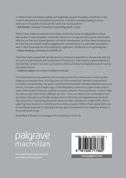 This book examines the powerful and intensifying role that metrics play in ordering and shaping our everyday lives. Focusing upon the interconnections between measurement, circulation and possibility, the author explores the interwoven relations between power and metrics. He draws upon a wide-range of interdisciplinary resources to place these metrics within their broader historical, political and social contexts. More specifically, he illuminates the various ways that metrics implicate our lives - from our work, to our consumption and our leisure, through to our bodily routines and the financial and organisational structures that surround us. Unravelling the power dynamics that underpin and reside within the so-called big data revolution, he develops the central concept of Metric Power along with a set of conceptual resources for thinking critically about the powerful role played by metrics in the social world today.