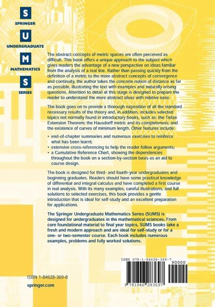 "This book is truly about metric spaces. ... The book is packed full of material which does not often appear in comparable books. ... His use of questions to increase understanding and to move on to the next topic are also to be appreciated. ... this is a great book and suitable ... for third-and fourth-year under-graduates and beginning graduate students." (Marion Cohen, MathDL, January, 2007)