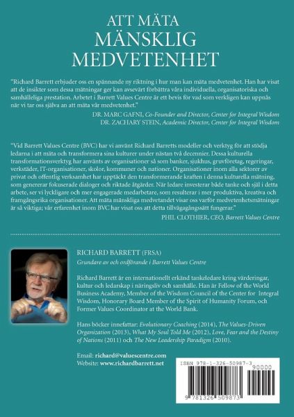 Richard Barrett offers us an exciting new direction for measuring consciousness. He has proven that the insights these measures bring can significantly improve our individual, organisational and societal performance. The work of the Barrett Values Centre stands as a testament to what can be achieved by seriously applying ourselves to the measurement of conscious." Dr. Marc Gafni, Co-Founder and Director, Center for Integral Wisdom Dr. Zachary Stein, Academic Director, Center for Integral Wisdom