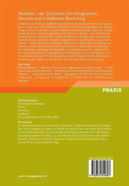Compliance wird oft als Verpflichtung betrachtet, die nur mit hohen Kosten umsetzbar ist. Dabei kann eine effiziente und effektive Umsetzung regulatorischer Anforderungen an die IT-Kontrollen zu einem Wettbewerbsvorteil werden, wenn der richtige Ansatz für deren Umsetzung gewählt wird. Ein solcher Ansatz - eine methodische Vorgehensweise, um durch den Einsatz von Metriken die Effektivität implementierter Kontrollen zu bewerten, Verbesserungspotential zu identifizieren und zu kommunizieren - wird in dem Buch vorgestellt. Neben einer umfassenden Sammlung von Metriken, welche direkt übernommen werden können, bietet das Buch ebenfalls die notwendige praxistaugliche Methodik zur Entwicklung weiterer eigener Metriken, Vorgehensweisen zur Aggregation von Metriken bis hin zur Informations- und Entscheidungsvorlagen für das Management sowie Beispiele für die angemessene Darstellung der Ergebnisse im Rahmen von Audit, Monitoring und Reporting.