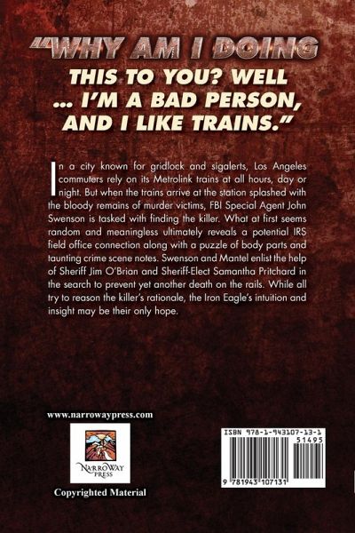 "Why am I doing this to you? Well … I'm a bad person, and I like trains." In a city known for gridlock and sigalerts, Los Angeles commuters rely on its Metrolink trains at all hours, day or night. But when the trains arrive at the station splashed with the bloody remains of murder victims, FBI Special Agent John Swenson is tasked with finding the killer. What at first seems random and meaningless ultimately reveals a potential IRS field office connection along with a puzzle of body parts and taunting crime scene notes. Swenson and Mantel enlist the help of Sheriff Jim O'Brian and Sheriff-Elect Samantha Pritchard in the search to prevent yet another death on the rails. While all try to reason the killer's rationale, the Iron Eagle's intuition and insight may be their only hope. Inside Flap: Rose Gerrard's splattered remains have been discovered on the tracks of the Pasadena Metrolink route. She was a fun-loving young woman attending Pasadena City College and working on her degree in accounting. For Rick Gerrard, her father and the head of criminal investigations for the Los Angeles field office of the IRS, the torturous murder of his only child comes on the heels of his wife's death due to cancer. When Gerrard suspects one of several locals who he audited and prosecuted for tax evasion may be responsible, his personal crusade to draw out the killer starts a chain reaction of murder and mayhem that sets a city on tilt and could send him on a one-way trip into the arms of the Iron Eagle.