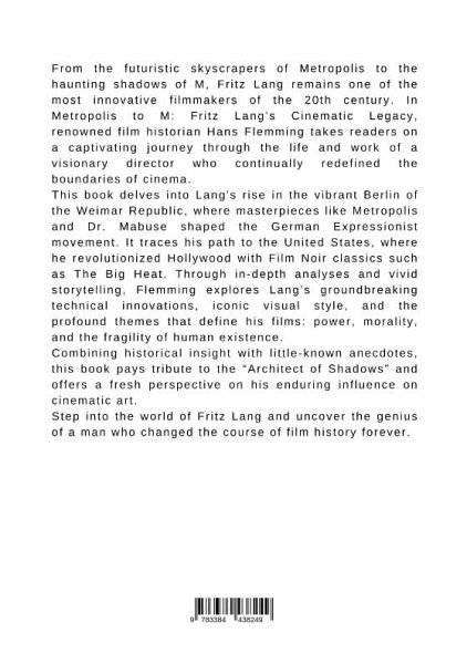 From the futuristic skyscrapers of Metropolis to the haunting shadows of M, Fritz Lang remains one of the most innovative filmmakers of the 20th century. In Metropolis to M: Fritz Lang's Cinematic Legacy, renowned film historian Hans Flemming takes readers on a captivating journey through the life and work of a visionary director who continually redefined the boundaries of cinema.This book delves into Lang's rise in the vibrant Berlin of the Weimar Republic, where masterpieces like Metropolis and Dr. Mabuse shaped the German Expressionist movement. It traces his path to the United States, where he revolutionized Hollywood with Film Noir classics such as The Big Heat. Through in-depth analyses and vivid storytelling, Flemming explores Lang's groundbreaking technical innovations, iconic visual style, and the profound themes that define his films: power, morality, and the fragility of human existence.Combining historical insight with little-known anecdotes, this book pays tribute tothe "Architect of Shadows" and offers a fresh perspective on his enduring influence on cinematic art.Step into the world of Fritz Lang and uncover the genius of a man who changed the course of film history forever.