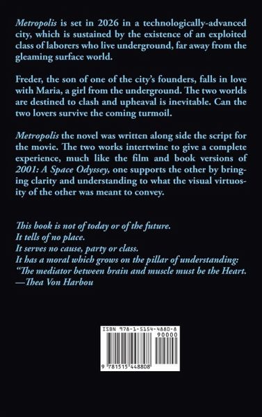 Metropolis is set in 2026 in a technologically-advanced city, which is sustained by the existence of an exploited class of laborers who live underground, far away from the gleaming surface world. Freder, the son of one of the city's founders, falls in love with Maria, a girl from the underground. The two worlds are destined to clash and upheaval is inevitable. Can the two lovers survive the coming turmoil. Metropolis the novel was written along side the script for the movie. The two works intertwine to give a complete experience, much like the film and book versions of 2001: A Space Odyssey, one supports the other by bringing clarity and understanding to what the visual virtuosity of the other was meant to convey. This book is not of today or of the future. It tells of no place. It serves no cause, party or class. It has a moral which grows on the pillar of understanding: "The mediator between brain and muscle must be the Heart. -Thea Von Harbou
