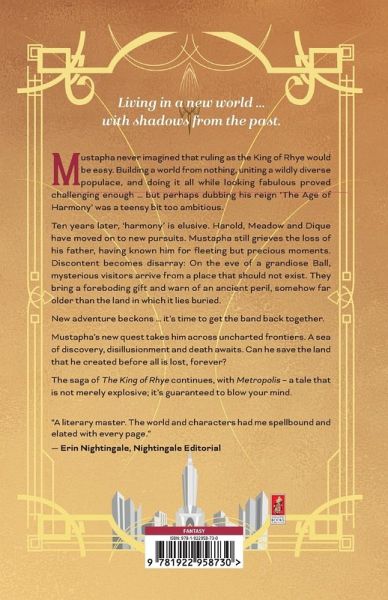 Living in a new world ... with shadows from the past. Mustapha never imagined that ruling as the King of Rhye would be easy. Building a world from nothing, uniting a wildly diverse populace, and doing it all while looking fabulous proved challenging enough ... but perhaps dubbing his reign 'The Age of Harmony' was a teensy bit too ambitious. Ten years later, 'harmony' is elusive. Harold, Meadow and Dique have moved on to new pursuits. Mustapha still grieves the loss of his father, having known him for fleeting but precious moments. Discontent becomes disarray: On the eve of a grandiose Ball, mysterious visitors arrive from a place that should not exist. They bring a foreboding gift and warn of an ancient peril, somehow far older than the land in which it lies buried. New adventure beckons ... it's time to get the band back together. Mustapha's new quest takes him across uncharted frontiers. A sea of discovery, disillusionment and death awaits. Can he save the land that he created before all is lost, forever? The saga of The King of Rhye continues, with Metropolis - a tale that is not merely explosive; it's guaranteed to blow your mind.
