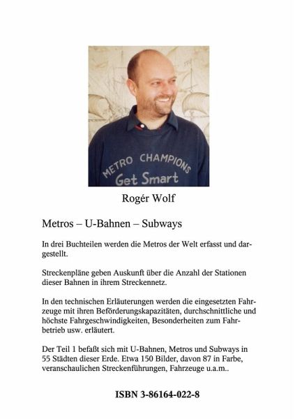Berlin, die Stadt in der er 1968 geboren wurde, in der er lebt. Erlernte Berufe: - Gas- und Wärmenetzmonteur, - Wirtschaftskaufmann, - Verlagskaufmann. Tätig als Verlagskaufmann. Zeichnet Karrikaturen, malt und fotographiert. Hatte mehrere Ausstellungen. Seinen ersten Preis erhielt er bereits als Siebenjähriger für ein gemaltes Bild anläßlich einer Ausstellung in Bukarest. Sein schauspielerisches Talent war in mehreren Kino- und Fernsehfilmen mit Mary Crosby, Audrey Landers, Mariele Millowitsch u.a. zu erkennen. In seiner Freizeit fährt er Ski, Abfahrt und Langlauf, surft, geht schwimmen oder spielt Tennis. Auf Radtouren durchquerte er die drei Baltischen Republiken und Weißrußland. Fuhr mit dem Rennrad von Berlin nach Prag und Warschau, unternahm Radtouren durch Deutschland, Frankreich und Luxemburg. Auf Lesungen las er aus Büchern, an denen er beteiligt war. Wie: - Pariser Impressionen ISBN 3-86164-003-1, - Wir in Rom ISBN 3-86164-002-3, - Dallas, Vision und Wirklichkeit ISBN 3-86164-005-8, - Der göttliche Blick ISBN 3-86164-001-5. Als Weltenbummler bereiste er mehr als vierzig Länder. Seine Liebe gilt Europa und Nordamerika. Eines seiner Hobbys wurde zum Inhalt seiner Bücher über die Untergrundbahnen der Welt. Die ersten beiden Teile sind erschienen: - Metros, U-Bahnen, Subways Teil 1, ISBN 3-86164-022-8 und - Metros, U-Bahnen, Subways Teil 2, ISBN 3-86164-020-1. Der Teil 3 ist in Arbeit und soll 2007 fertig werden. Rogér Wolf ist Inhaber von 2 Patenten. Eines über die energiearme Beschleunigung und Verzögerung schienengebundener Fahrzeuge. Es wurde in Finnland realisiert. Das zweite dient der Enteisung von Luftfahrzeugen. Es wird in Kanada und Frankreich angewendet.