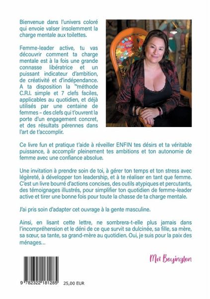 Bienvenue dans l'univers coloré qui envoie valser insolemment la charge mentale aux toilettes.Femme-leader active, tu vas découvrir comment ta charge mentale est à la fois une grande connasse libératrice et un puissant indicateur d'ambition, de créativité et d'indépendance. A ta disposition la méthode C.R.I. simple et 7 clefs faciles, applicables au quotidien, et déjà utilisées par une centaine de femmes - des clefs qui t'ouvrent la porte d'un engagement concret, et des résultats pérennes dans l'art de t'accomplir.Ce livre fun et pratique t'aide à réveiller ENFIN tes désirs et ta véritable puissance, à accomplir pleinement tes ambitions et ton autonomie de femme avec une confiance absolue.Une invitation à prendre soin de toi, à gérer ton temps et ton stress avec légèreté, à développer ton leadership, et à te réaliser en tant que femme. C'est un livre bourré d'actions concises, d'outils atypiques et percutants, de témoignages illustrés, pour simplifier ton quotidien de femme-leader active et tirer une bonne fois pour toute la chasse de ta charge mentale - même pour les jeunes générations de filles.J'ai pris soin d'adapter cet ouvrage à la gente masculine.Ainsi, en lisant cette lettre, ne sombrera-t-elle plus jamais dans l'incompréhension et le déni de ce que survit sa dulcinée, sa fille, sa mère, sa soeur, sa tante, sa grand-mère au quotidien. Oui, je suis pour la paix des ménages...