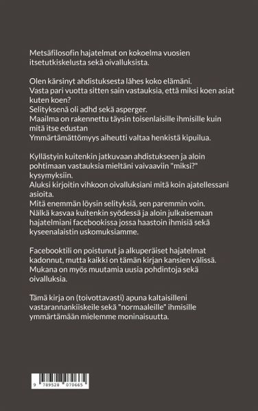 Mitä meistä jää, kun kaikki katoaa? En osaa vastata tuohon kysymykseen yleisellä tasolla, ainoastaan yksilötasolla. Metsäfilosofin hajatelmat on kokoelma vuosien ajalta, jolloin aloin harrastamaan itsetutkiskelua sekä vastausten etsimistä mieltäni vaivaaviin kysymyksiin. Vasta pari vuotta sitten sain vastauksia, että miksi koen asiat kuten koen. Selityksenä on adhd sekä asperger, että miksi olen kokenut elämäni aikana paljon ongelmia. Maailma on tehty täysin toisenlaisille ihmisille kuin mitä itse edustan, mikä selittää miksi henkinen kipuilu on ollut valtavaa. Kyllästyin kuitenkin tuohon jatkuvaan ahdistukseen ja aloin hakemaan vastauksia mieltäni vaivaaviin "miksi?" kysymyksiin sekä epäkohtiin. Kirjoitin aluksi vihkoon oivalluksiani mitä koin ajatellessani asioita. Ymmärrys helpotti olotilaani. Nälkä kasvaa kuitenkin syödessä ja aloin julkaisemaan hajatelmiani facebookissa jossa haastoin ihmisiä sekä kyseenalaistin uskomuksiamme. Kaikki tämä työ on antanut minulle suuntaa elämääni. Tämä kirja on (toivottavasti) muille kaltaisilleni vastarannankiiskeile apu ymmärtämään mielemme moninaisuutta sekä heille, jotka yrittävät ymmärtää mieltämme.