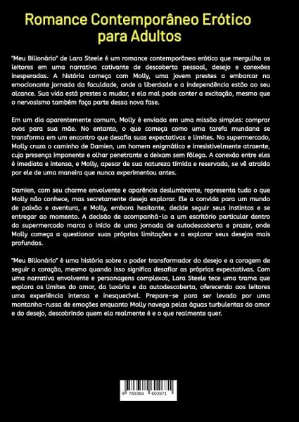 "Meu Bilionário" de Lara Steele é um romance contemporâneo erótico que mergulha os leitores em uma narrativa cativante de descoberta pessoal, desejo e conexões inesperadas. A história começa com Molly, uma jovem prestes a embarcar na emocionante jornada da faculdade, onde a liberdade e a independência estão ao seu alcance. Sua vida está prestes a mudar, e ela mal pode conter a excitação, mesmo que o nervosismo também faça parte dessa nova fase.Em um dia aparentemente comum, Molly é enviada em uma missão simples: comprar ovos para sua mãe. No entanto, o que começa como uma tarefa mundana se transforma em um encontro que desafia suas expectativas e limites. No supermercado, Molly cruza o caminho de Damien, um homem enigmático e irresistivelmente atraente, cuja presença imponente e olhar penetrante a deixam sem fôlego. A conexão entre eles é imediata e intensa, e Molly, apesar de sua natureza tímida e reservada, se vê atraída por ele de uma maneira que nunca experimentou antes.Damien, com seu charme envolvente e aparência deslumbrante, representa tudo o que Molly não conhece, mas secretamente deseja explorar. Ele a convida para um mundo de paixão e aventura, e Molly, embora hesitante, decide seguir seus instintos e se entregar ao momento. A decisão de acompanhá-lo a um escritório particular dentro do supermercado marca o início de uma jornada de autodescoberta e prazer, onde Molly começa a questionar suas próprias limitações e a explorar seus desejos mais profundos."Meu Bilionário" é uma história sobre o poder transformador do desejo e a coragem de seguir o coração, mesmo quando isso significa desafiar as próprias expectativas. Com uma narrativa envolvente e personagens complexos, Lara Steele tece uma trama que explora os limites do amor, da luxúria e da autodescoberta, oferecendo aos leitores uma experiência intensa e inesquecível. Prepare-se para ser levado por uma montanha-russa de emoções enquanto Molly navega pelas águas turbulentas do amor e do desejo,descobrindo quem ela realmente é e o que realmente quer.