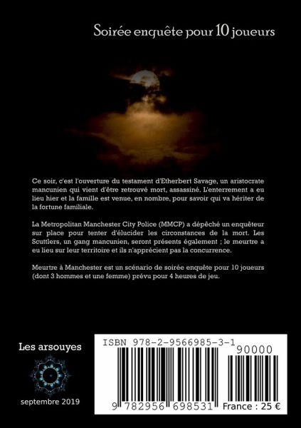 Ce soir, c'est l'ouverture du testament d'Etherbert Savage, un aristocrate mancunien qui vient d'être retrouvé mort, assassiné. L'enterrement a eu lieu hier et la famille est venue, en nombre, pour savoir qui va hériter de la fortune familiale. La Metropolitan Manchester City Police (MMCP) a dépêché un enquêteur sur place pour tenter d'élucider les circonstances de la mort. Les Scuttlers, un gang mancunien, seront présents également ; le meurtre a eu lieu sur leur territoire et ils n'apprécient pas la concurrence. Meurtre à Manchester est un scénario de soirée enquête pour 10 joueurs (dont 3 hommes et une femme) prévu pour 4 heures de jeu.