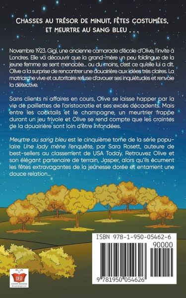 Chasses au trésor de minuit, fêtes costumées, et meurtre au sang bleu . . . Novembre 1923. Gigi, une ancienne camarade d'école d'Olive, l'invite à Londres. Elle va découvrir que la grand-mère un peu foldingue de la jeune femme se sent menacée… ou du moins, c'est ce qu'elle lui a dit. Olive a la surprise de rencontrer une douairière aux idées très claires. La matriarche vive et autoritaire refuse d'avouer ses inquiétudes et renvoie la détective. Sans clients ni affaires en cours, Olive se laisse happer par la vie de paillettes de l'aristocratie et ses excès décadents. Mais entre les cocktails et le champagne, un meurtrier frappe durant un jeu frivole et Olive se rend compte que les craintes de la douairière sont loin d'être infondées. Meurtre au sang bleu est le cinquième tome de la série populaire Une lady mène l'enquête, par Sara Rosett, auteure de best-sellers au classement de USA Today. Retrouvez Olive et son élégant partenaire de terrain, Jasper, alors qu'ils écument les fêtes extravagantes de la jeunesse dorée et entament une douce relation . . .