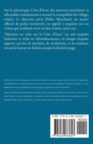Sur la pittoresque Côte d'Azur, des meurtres mystérieux et effroyables commencent à secouer la tranquillité des villages côtiers. Le détective privé Didier Marchand, un ancien officier de police reconverti, est appelé à enquêter sur ces crimes qui semblent avoir un lien sinistre entre eux. "Meurtres en série sur la Côte d'Azur" est une enquête haletante et riche en rebondissements, où chaque chapitre apporte son lot de mystères, de révélations, et de tensions, tenant le lecteur en haleine jusqu'à la dernière page.